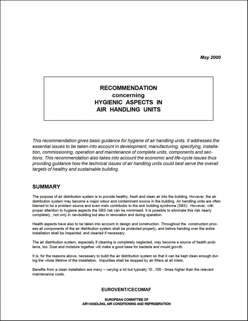 This recommendation gives basic guidance for hygiene of air handling units. It addresses the essential issues to be taken into account in development, manufacturing, specifying, installation, commissioning, operation and maintenance of complete units, components and sections. This recommendation also takes into account the economic and life-cycle issues this targets of healthy and sustainable building. This document is available in English.